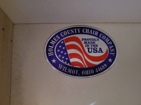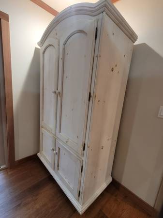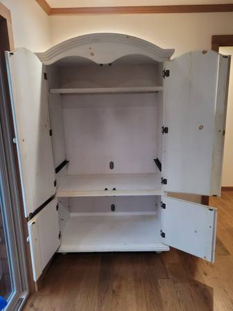 Amish US-made, off-white, heavy-duty armoire. This can easily be used for a family room or bedroom. The main shelf has extra support for a heavy equipment like TV, stereo, etc. Each shelf has a small oval in the back to allow for wires to run through so they are not exposed. There are also two openings in the back for wires (in the photos there is tape over them). It is also great for a bedroom with all the storage space. It is made of wood and particle board (the shelves) and back. There is crack in the largest shelf (photo included), but it is not visible when viewing the armoire from the front.